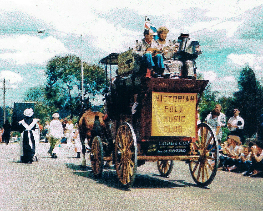 Eltham Community Festival Parade, 8 November 1986. Stage coach by Ben Hall (great grandson of the bushranger).